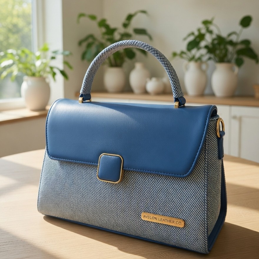 A refined blend of structure and softness, the Avelon Azure Grace Satchel is designed for modern elegance. Crafted with a sophisticated mix of textured denim fabric and smooth navy leather, this piece offers a timeless silhouette with a contemporary edge. The structured top handle, accented with woven detailing, adds a touch of artisanal charm, while the gold-tone hardware brings subtle luxury.