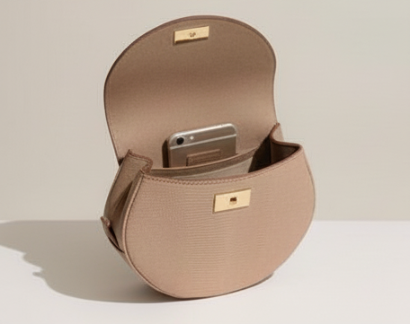 Shoulder bag made of smooth calfskin, featuring clean, essential lines. The style features a light gold-coloured metal teardrop-shaped twist lock – a functional and stylistic detail reminiscent of an archive piece, a triple-gusseted construction making it spacious yet compact, and a shoulder strap that can be extended for wearing two ways. A practical and versatile offering, perfect for day use.